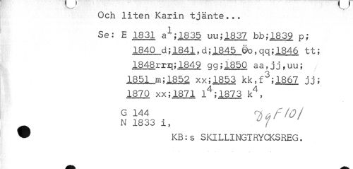 //// Och liten Karin tjänte... //// Se: E 1831 a1;1835 uu;1837 bb;1839 p; //// • • • //// 1840 d;1841,d;1845 0o,gg;1846 tt; 1848rra;1849 gg;1850 aa,jj,uu; 1851 m;1852 xx;1853 kk,f3;1867 jj; 1870 xx;1871 14;1873 k4, //// G 144 oSa fiol //// N 1833 i, //// ^ KB:s SKILLINGTRYCKSREG. ////