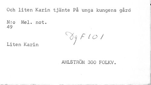 //// I //// Och liten Karin tjänte På unga kungens gård //// N:o Mel. not. 49 //// ^ F lo / //// Liten Karin //// . i //// AHLSTRÖM 300 FOLKV. ////