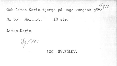 //// JKn7 //// Och liten Karin tjente på unga kungens gard Nr 55. Mel.not. 13 str. //// Liten Karin //// 15t f/*/ //// 100 SV.FOLKV. ////