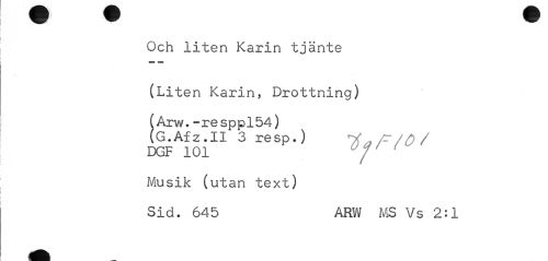 //// Och liten Karin tjänte //// (Liten Karin, Drottning) (Arw.-resppl54) //// (G.Afz.II 3 resp.) ; / >F/ö/ DGF 101 //// Musik (utan text) //// Sid. 645 ARW MS Vs 2:1 ////