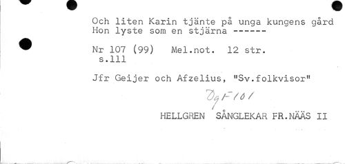 //// Och liten Karin tjänte på unga kungens gård Hon lyste som en stjärna --- //// ® Nr 107 (99) Mel.not. 12 str. //// s.lll //// r //// 9 //// Jfr Geijer och Afzelius, "Sv.folkvisor" //// h/6/ //// HELLGREN Sy\NGLEKAR FR.NÄÄS II ////