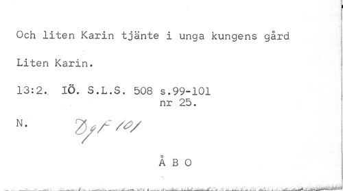 //// Och liten Karin tjänte i unga kungens gård Liten Karin. //// 13:2. IÖ. S.L.S. 508 s.99-101 //// nr 25. //// N- 2J/ //// ÅBO //// » ^ < . » . ? . I Vwf _ ..., M- 1 . , i".../A - v i ---_-—---' ////