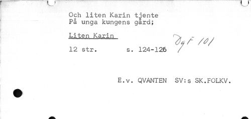 //// ^ "V- w //// Och liten Karin tjente På unga kungens gård; //// Liten Karin ~ . „ . //// 12 str. s. 124-126 //// E.v. QVANTEN SV:s SK.FOLKV. ////