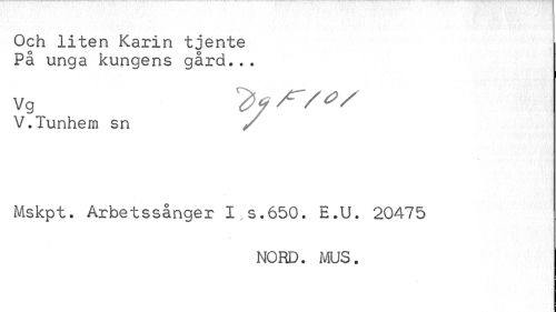 //// Och liten Karin tjente På unga kungens gård... //// vg //// V.Tunhern sn / //// Mskpt. Arbetssånger I,s.650. E.U. 20475 //// NORD. MUS. ////