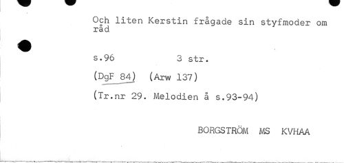 //// Och liten Kerstin frågade sin styfmoder om råd //// s.96 3 str. //// (DgF 84) (Arw 137) //// (Tr.nr 29. Melodien å s.93-94) //// BORGSTRÖM MS KVHAA //// . __^.A. ... Al*. ---I k <__l., — _ W . 4___--- - . Bk . . _ ////