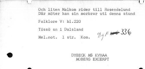 //// Och liten Malkom rider till Rosendelund Där möter han sin morbror uti denna stund //// ? //// Folklore V: bl.220 //// Tössö sn i Dalsland 33 //// Mel.not. 1 str. Kom. //// DYBECK MS KVHAA MOBERG EXCERPT ////