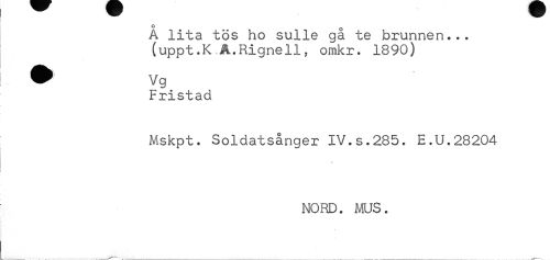 //// ° o //// A lita tös ho sulle ga te brunnen... (uppt.K.A.Rignell, omkr. 1890) //// Fristad //// Mskpt. Soldatsånger IV.s.285. E.U.28204 //// »» //// NORD. MUS. ////