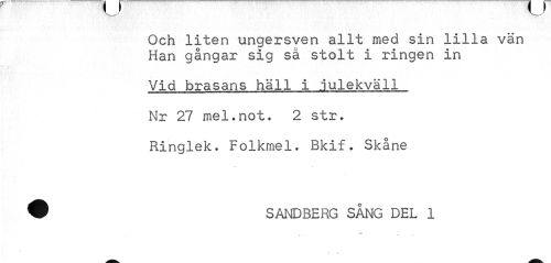 //// Och liten ungersven allt med sin lilla vän Han gångar sig sä stolt i ringen in //// Vid brasans häll i julekväll //// Nr 27 mel.not. 2 str. //// Ringlek. Folkmel. Bkif. Skåne //// ® SANDBERG SÅNG DEL 1 ////