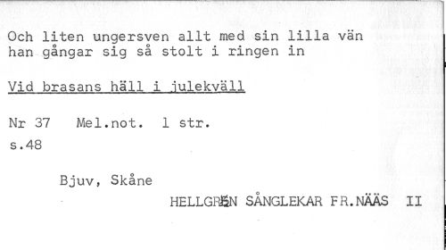 //// Och liten ungersven allt med sin lilla vän han gångar sig så stolt i ringen in //// Vid brasans häll i julekväll //// Nr 37 Mel.not. 1 str. s .48 //// / //// Bjuv, Skåne //// HELLGR&N SÅNGLEKAR FR.NÄÄS II j ////