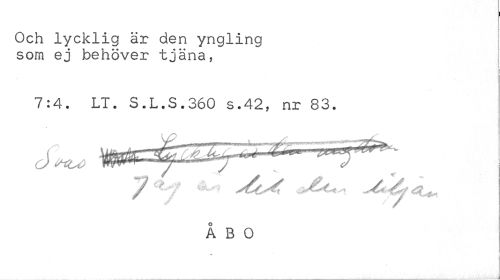//// I //// Och lycklig är den yngling som ej behöver tjäna, //// [ //// 7:4. LT. S.L.S.360 s.42, nr 83. //// / / / //// ÅBO //// ___A ////