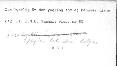 //// Och lycklig är den yngling som ej behöver tjäna. 6:2 LT. I.N.E. Gammals visb. nr 80 //// rJ> //// / / ¦ / //// ÅBO ////