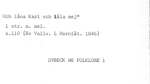 //// Och låna Kari och iåla mej" 1 str. m. mel. //// s.110 (Sv Vallv. L Hornlåt. 1846) //// i //// 1 j //// - //// DYBECK MS FOLKLORE 1 ////