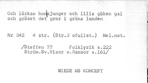 //// Och lärkan honjsjunger och lilla göken gal och gräset det gror i gröna lunden //// i //// Nr 342 4 str. (Str.3 ofullst.) Mel.not. //// /Steffen ?? Folklyrik s.222 //// Ström.Sv,Visor o.Ramsor s.161/ //// WIEDE MS KONCEPT ////