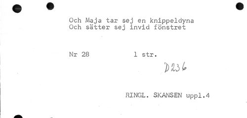 //// Och Maja tar sej en knippeldyna Och sätter sej invid fönstret //// Nr 28 1 str. //// TUbL //// RINGL. SKANSEN upp 1.4 //// •¦C //// r ////