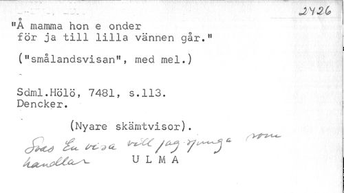 //// -:-¦.¦¦•'.',, _ , JL Y^Cf //// O //// "A mamma hon e onder för ja till lilla vännen går." //// ¦ ¦ //// ("smålandsvisan", med mel.) //// Sdml.Hölö, 7481, s.113. Dencker. //// (Nyare skämtvisor). //// AJWÄ^ U L M A ////
