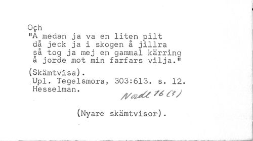 //// i //// Ogh //// "A medan ja va en liten pilt då jeck ja i skogen å jillra så tog ja mej en gammal kärring å jorde mot min farfars vilja." //// (Skämtvisa). //// Upl. Tegelsmora, 303:613. s. 12. Hesselmaru ^ ^ //// i //// (Nyare skämtvisor). //// . . , o. .. . 1 ___^ ////