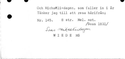 //// Och Michaäli-dagen, som faller in i år Tänker jag till att resa härifrån; //// Nr. 145. 8 str. Mel. not. //// /Svas 1831/ //// WIEDE MS //// •i' * t ////