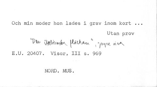 //// 1 //// ¦ //// Och min moder hon lades i grav inom kort ... //// Utan prov //// E.U. 20407. Visor, III s. 969 //// NORD. MUS. ////