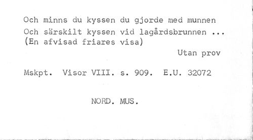 //// Och minns du kyssen du gjorde med munnen //// Och särskilt kyssen vid lagårdsbrunnen ... (En afvisad friares visa) //// Utan prov //// Mskpt. Visor VIII. s. 909. E.U. 32072 //// j i //// NORD. MUS. //// i //// J //// ___i___j ////