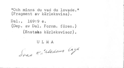 //// i //// "Och minns du vad du lovade." i //// (Fragment av kärleksvisa). I //// Dal., 169:9 e. j //// (Dep. av Dal. Fornm. fören.) I //// (Enstafea kärleksvisor). j //// U L M A | //// r... . a. . A___ % .. _ ////