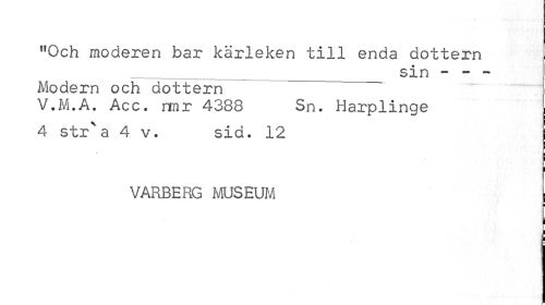 //// / //// "Och moderen bar kärleken till enda dottern //// sin - - - //// Modern och dottern //// V.M .A. Acc. nmr 4388 Sn. Harplinge 4 str^a 4 v. sid. 12 j //// VARBERG MUSEUM //// ¦ ////