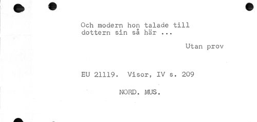 //// Och modern hon talade till dottern sin så här ... //// Utan prov EU 21119. Visor, IV s. 209 //// rf //// NORD. MUS. ////