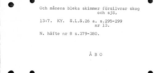 //// Och månens bleka skimmer försilvrar skog //// och sjö, //// 13:7. KY. S.L.S.26 a. s.295-299 //// nr 13. //// N. häfte nr 8 s.379-380. //// ÅBO ////