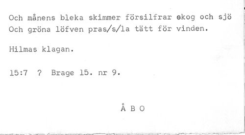 //// I //// Och månens bleka skimmer försilfrar ekog och sjö Och gröna lofven pras/s/la tätt för vinden. //// Hilmas klagan. //// 15:7 ? Brage 15. nr 9. //// ÅBO ////