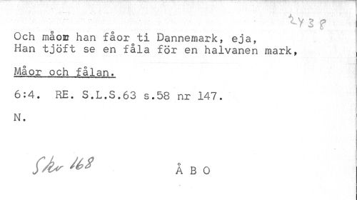 //// ^Y 5 f //// Och måoB han fåorQti Dannemark, eja, Han tjöft se en fåla för en halvanen mark, //// Måor och fålan. //// 6:4. RE. S.L.S.63 s.58 nr 147. N. //// {År & 2 åbo ////