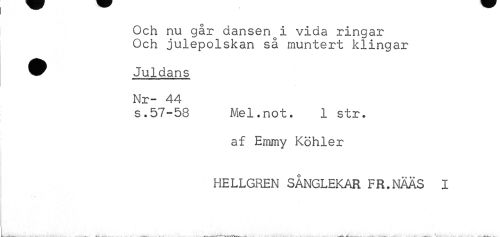 //// Och nu går dansenoi vida ringar Och julepolskan så muntert klingar //// ^ Juldans //// Nr- 44 //// s.57-53 Mel.not. 1 str. //// af Emmy Köhler //// KELLGREN SÅNGLEKAR FR.NÄAS I ////