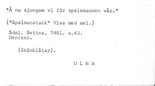 //// o //// "A nu sjungom vi för spelemannen vår.11 //// ("Spelmanstack" Visa med mel.) //// Sdml. Bettna, 7481, s.43. Dencker. //// (Skänklåtar). //// U L M A ////