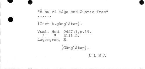 //// o o //// 11A nu vi taga med Gustav fram" ^ (Text t.gånglåtar). //// Vsml. Hed, 2447:1,s.19. //// 11 11 3111:2. Lagergren, E. //// (Gånglåtar). //// U L M A ////