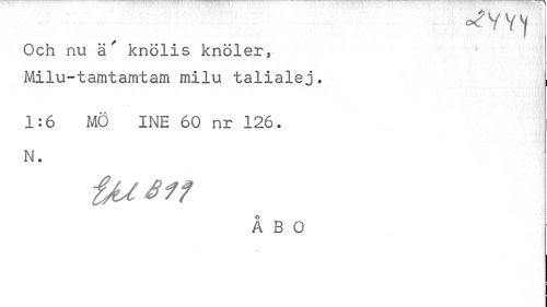 //// Y Y^ //// Och nu ä' knölis knöler, Milu-tamtamtam milu talialej. //// 1:6 MÖ INE 60 nr 126. N. //// ÅBO ////