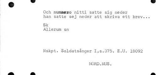 //// Och nummezio nitti satte sig neder //// han satte sej neder att skriva ett brev... //// Sk //// Allerum sn //// Mskpt. Soldatsånger I,s.375. E.U. 1SQ92 //// NORD.MUS. ////