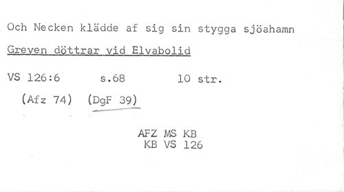 //// Och Necken klädde af sig sin stygga sjöahamn Greven döttrar vid Elvabolid //// VS 126:6 s.68 10 str. //// I //// (Af z 74) (DgF 39) //// AFZ MS KB KB VS 126 //// 1 //// •v. ////