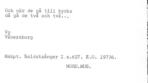 //// Och när de gå till kyrka då gå de två och två... //// Vg //// Vänersborg i //// i //// | //// i //// Mskpt. Soldatsånger I,s.627. E.U. 19736. i //// NORD.MUS. ////