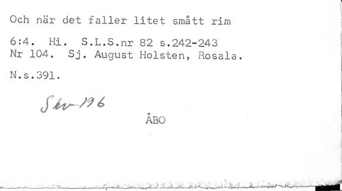 //// Och när det faller litet smått rim //// i //// 6:4. Hi. s.l.s.nr 82 s.242-243 Nr 104. sj. August Holsten, Rosala. //// N.s.391. //// ÅBO ////