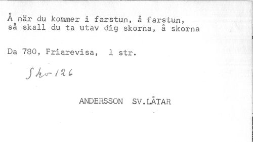 //// o //// A^när du kommer i farstun, å farstun, så skall du ta utav dig skorna, å skorna //// Da 780, Friarevisa, 1 str. //// Jksrnt //// % //// ANDERSSON SV.LÅTAR ////