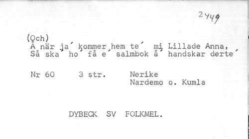 //// _ //// (Qch) //// A när 4a kommer^hem te mi Lillade Anna, Så ska ho' få e' salmbok å' handskar derte' //// Nr 60 3 str. Nerike //// Nardemo o. Kumla //// _ //// DYBECK SV FOLKMEL. ////