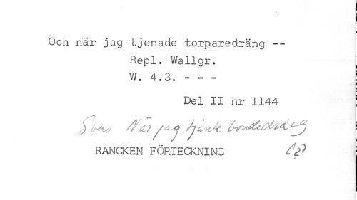 //// Och när jag tjenade torparedräng -- //// Repl. Wallgr. //// W. 4.3.---! //// Del II nr 1144 | //// J) ^tru^^d^ I //// RANCKEN FÖRTECKNING Sp ii //// A ////