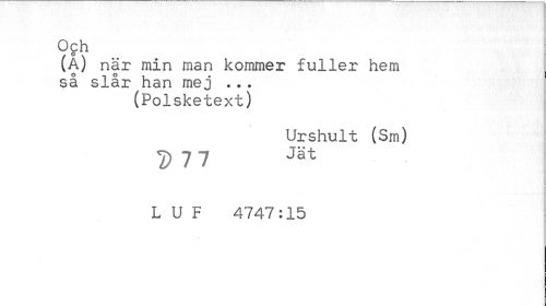 //// Och //// (A) när min man kommer fuller hem så slår han mej ... //// (Polsketext) //// Urshult (Sm) //// D 11 Jät //// L U F 4747:15 ////
