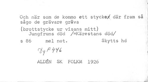 //// Och när som de kommo ett stycke/ där fram så j sågo de grävare gräva j //// (brottstycke ur visans mitt) //// Jungfruns död /=Kärestans död/ j //// l //// s 86 mel not. Skytts hd ! //// typ ML J //// ALDnN SK FOLKM 1926 //// (I //// i ////