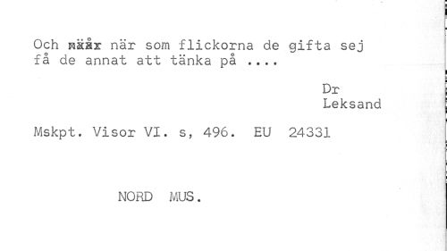 //// ; m //// Och wäår när som flickorna de gifta sej få de annat att tänka på ... //// ! //// Dr //// Leksand //// i //// Mskpt. Visor VI. s, 496. EU 24331 //// NORD MUS. ////