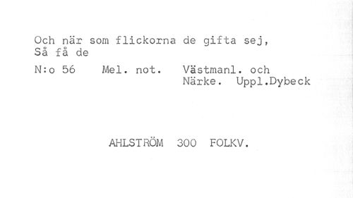 //// Och när som flickorna de gifta sej, //// Så få de //// N:o 56 Mel. not. Västmanl. och //// Närke. Uppl.Dybe ck //// AHLSTRÖM 300 FQLKV. ////
