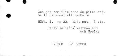 //// Och när som flickorna de gifta sej, ^^ Så få de annat att tänka på //// Haft. I. nr 22, Mel. ntot. 1 str. //// Dansvisa fråryrf Vestmanland //// och Nerike //// DYBECK SV VISOR ////