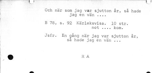 //// V / v / //// é ' //// Och när som jag var sjutton år, så hade //// jag en vän ... //// B 78, s. 92 Kärleksvisa. 10 str. //// not ... kom. //// Jsfr. En c^ång när jag var sjutton år, //// sa hade jag en vän . . . ////