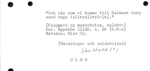 //// "Och när som vi kommo till Kalmare torg sund hopp falleralleri-lej." //// (Fragment ur marschvisa, soldat-) Dal. Äppelbo 11126, s. 26 (h.8:o) Matsson, Niss Hj. //// (Bevärings- och soldatvisor) //// (i) //// U L M A ////