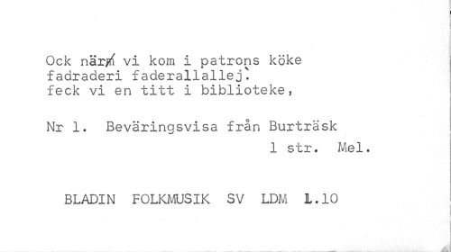 //// I //// Ock närjaf vi kom i patrons köke fadraderi faderallallej feck vi en titt i biblioteke, //// Nr 1. Beväringsvisa från Burträsk //// 1 str. Mel. //// BLADIN FOLKMUSIK SV LDM L.10 //// j //// i ////