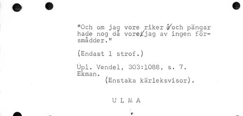 //// nOch om jag vore riker ^och pangar hade nog da vore/jag av ingen för-smådder." //// (Endast 1 strof.) //// Upl. Vendel, 303:1088, s. 7. Ekman. //// (Enstaka kärleksvisor). U L M A ////