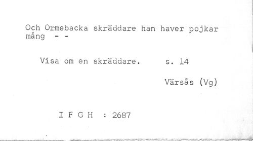 //// Och Ormebacka skräddare han haver pojkar mång - - //// Visa om en skräddare. s. 14 //// Värsås (Vg) //// I F G H : 2687 ////